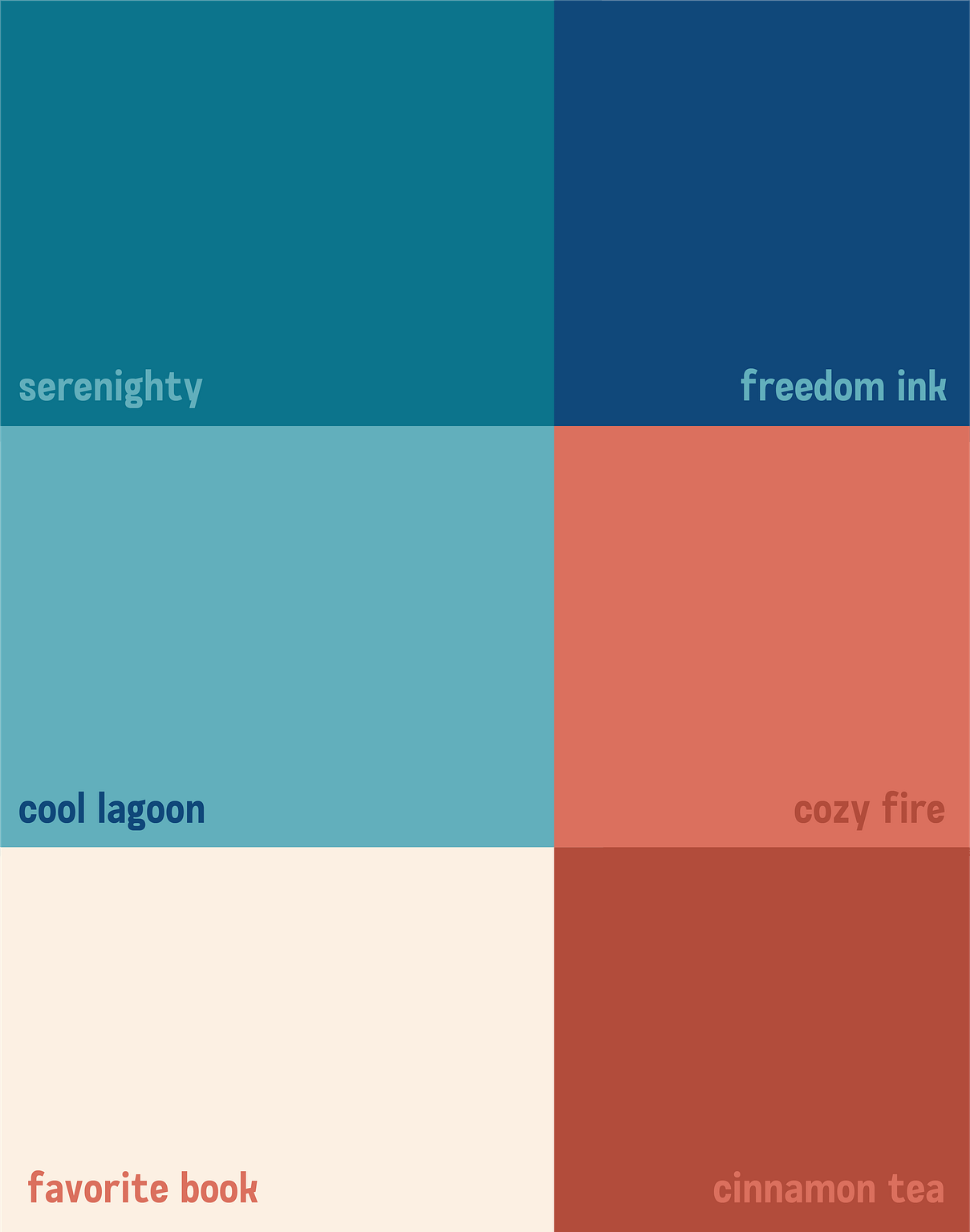 - une palette de couleurs qui mêle chauds et froids : un équilibre entre les terreux chaleureux et les 3 nuances de bleus alliant profondeur et fraîcheur