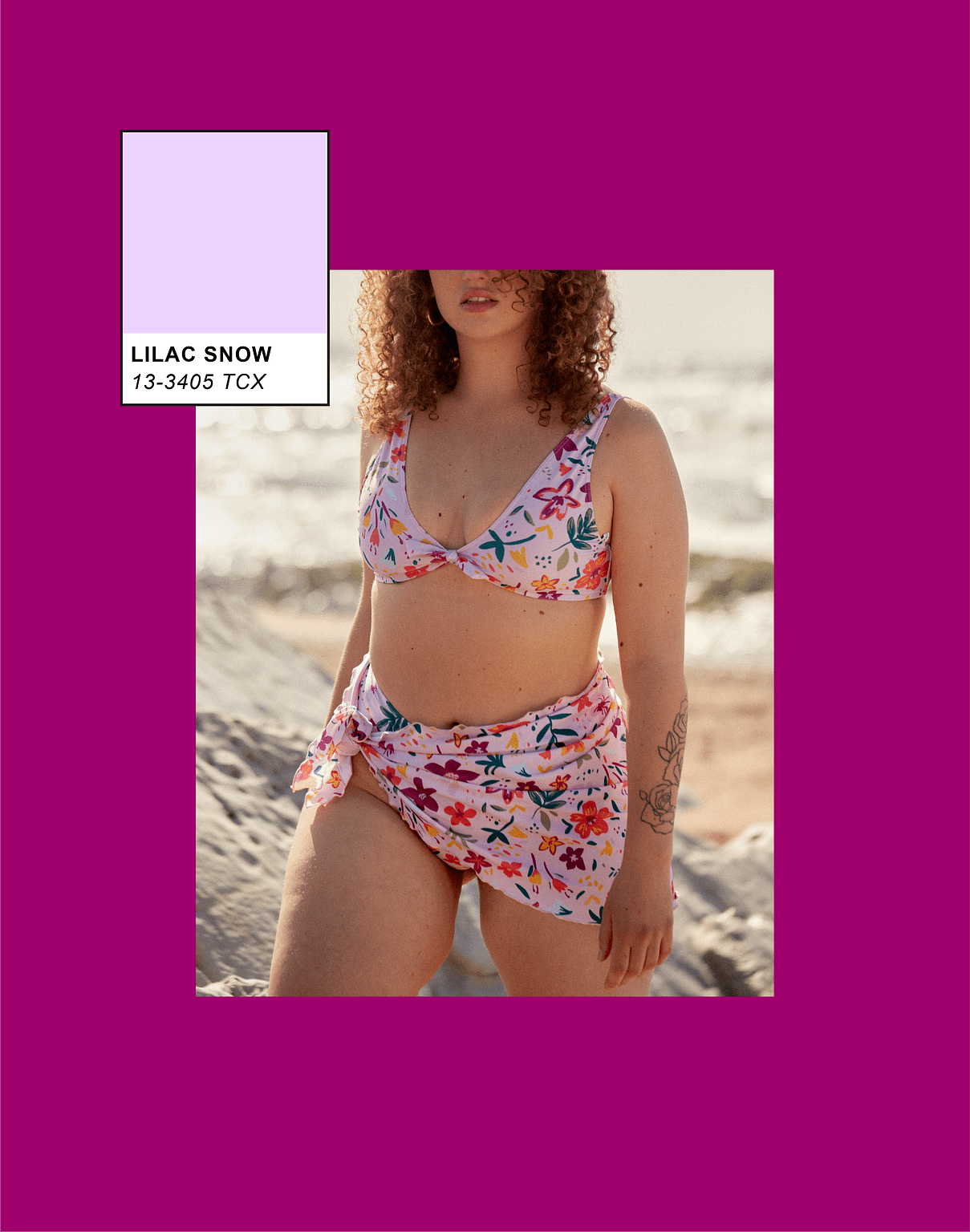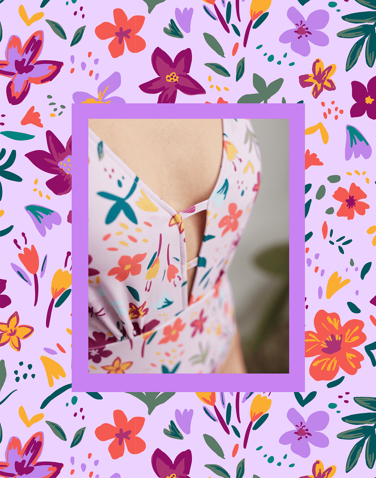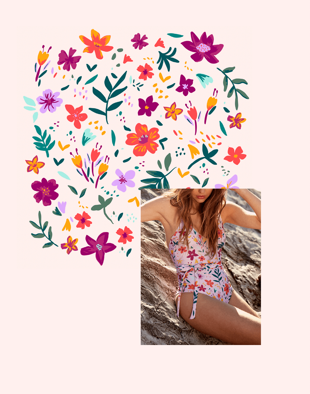 En 2021, Priscille a fait appel à mes services de designeuse textile pour la création d’un imprimé floral pictural qui habillerait sa collection printemps-été 2022. Après des tests graphiques et couleurs, ce motif all over a vu le jour : un bouquet aux couleurs flamboyantes, évoquant l’arrivée de l’été. La palette chromatique est à la fois douce, avec le fond mauve pastel, et flamboyante, grâce aux nuances vives et éclatantes de ce bal floral 💐