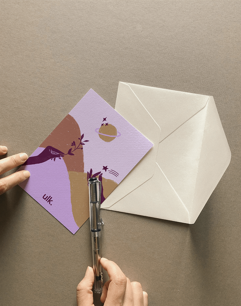 Mélanie & Benjamin ont fait appel à mes services pour créer une illustration poétique à offrir à leurs clients, à l’occasion du changement d’identité de leur studio de marketing digital Studio Ulk 🪐